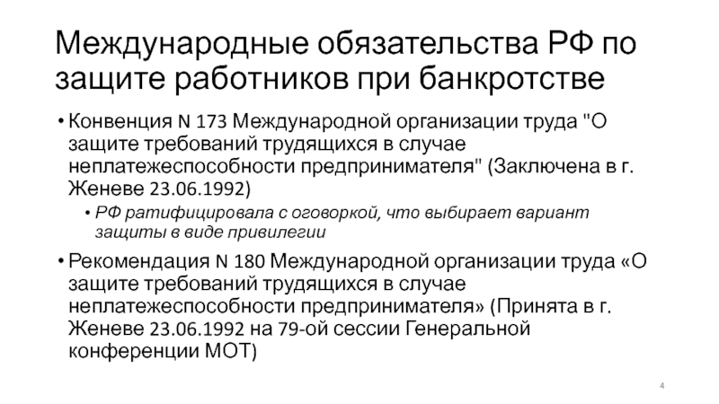 Слайд 4Международные обязательства РФ по защите работников при банкротстве