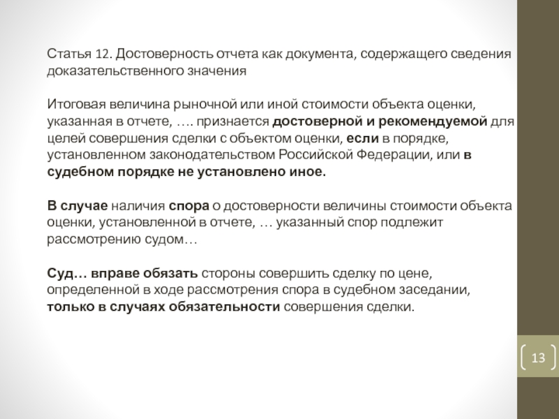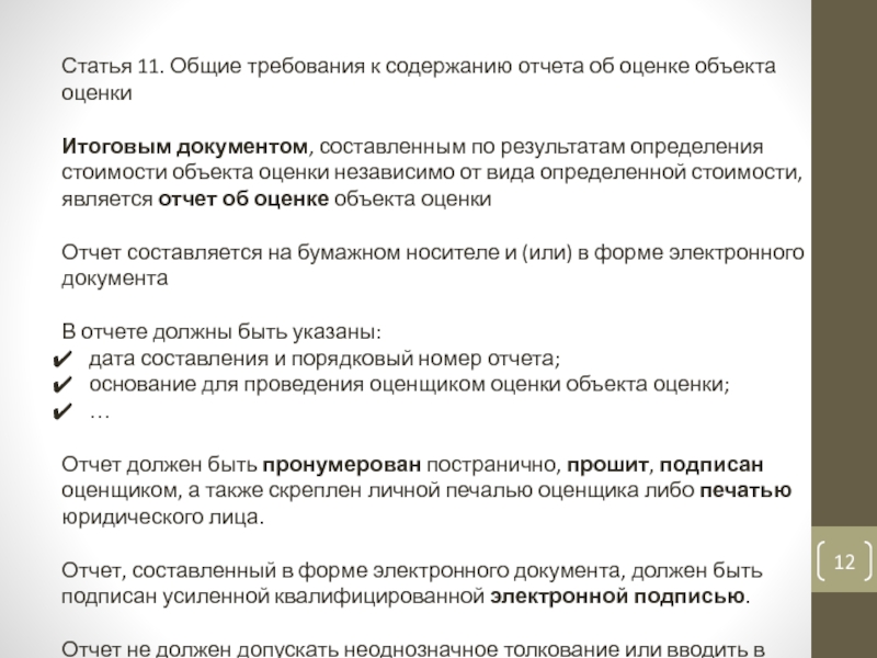 Слайд 12Статья 11. Общие требования к содержанию отчета об оценке объекта