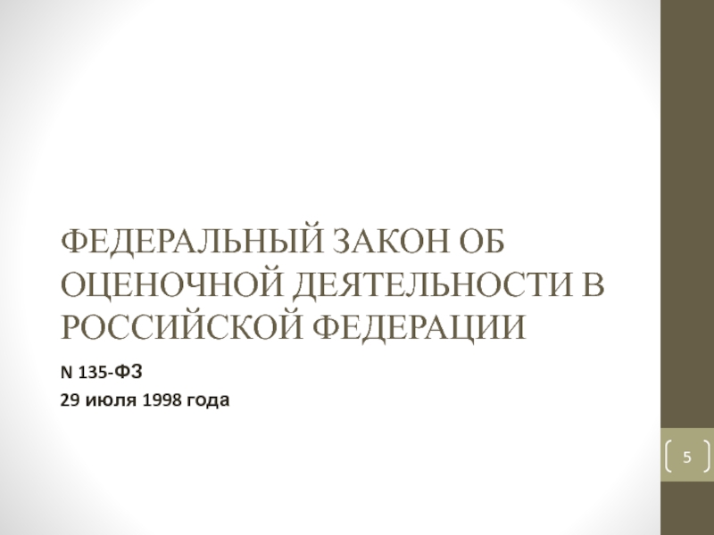 Слайд 5ФЕДЕРАЛЬНЫЙ ЗАКОН ОБ ОЦЕНОЧНОЙ ДЕЯТЕЛЬНОСТИ В РОССИЙСКОЙ ФЕДЕРАЦИИ