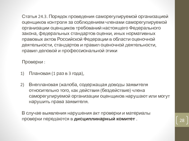 Слайд 28Статья 24.3. Порядок проведения саморегулируемой организацией оценщиков контроля за соблюдением