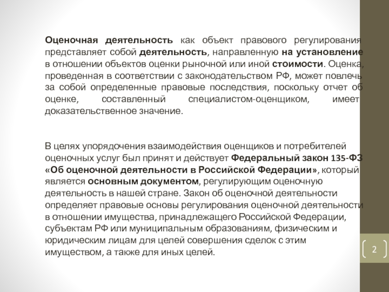 Слайд 2Оценочная деятельность как объект правового регулирования представляет собой деятельность, направленную