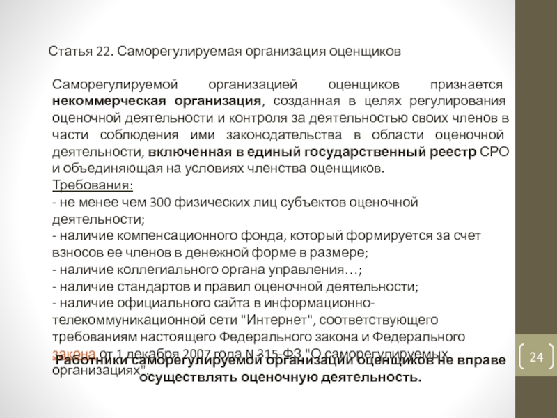 Слайд 24Статья 22. Саморегулируемая организация оценщиков