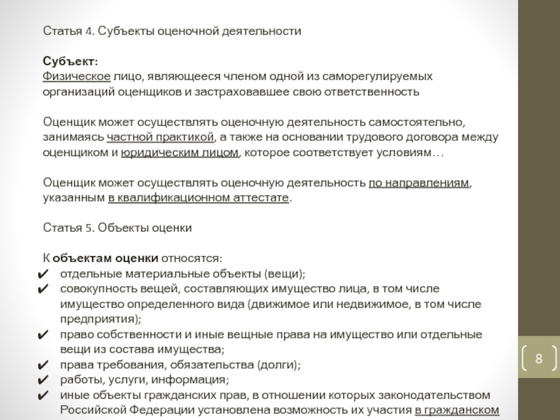 Слайд 8Статья 4. Субъекты оценочной деятельности