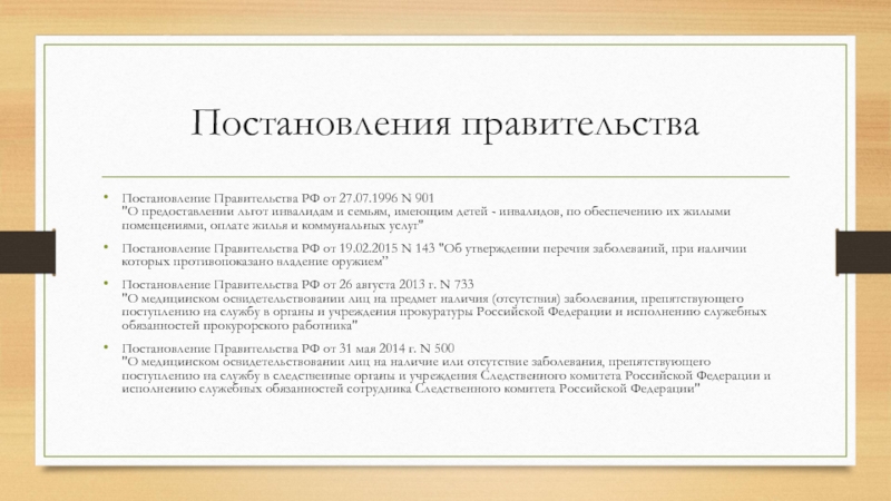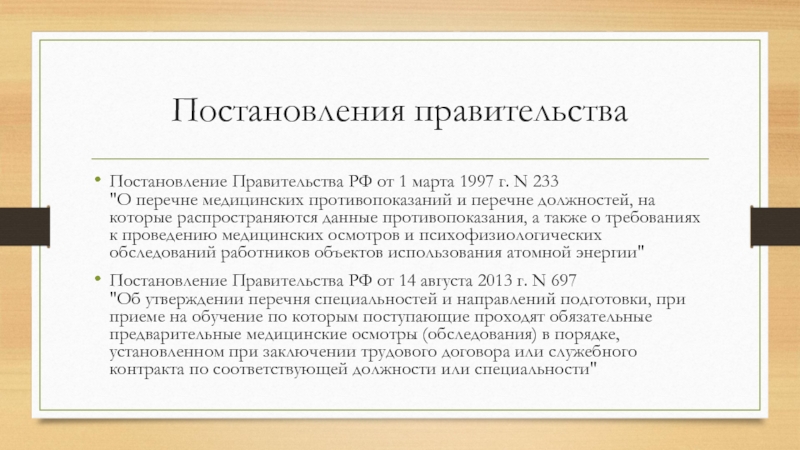 Слайд 34Постановление Правительства РФ от 29.12.2014 N 1604"О перечнях медицинских противопоказаний,