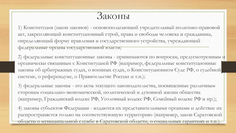 Федерации. Законы и иные правовые акты, принимаемые в Российской Федерации, не должны противоречить Конституции Российской Федерации. (Статья 15 Конституции РФ)