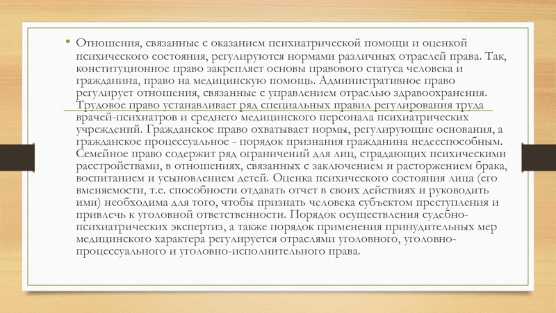 правового статуса человека и гражданина, право на медицинскую помощь. Административное право регулирует отношения, связанные с управлением отраслью здравоохранения. Трудовое право устанавливает ряд специальных правил регулирования труда врачей-психиатров и среднего медицинского персонала психиатрических учреждений. Гражданское право охватывает нормы, регулирующие основания, а гражданское процессуальное - порядок признания гражданина недееспособным. Семейное право содержит ряд ограничений для лиц, страдающих психическими расстройствами, в отношениях, связанных с заключением и расторжением брака, воспитанием и усыновлением детей. Оценка психического состояния лица (его вменяемости, т.е. способности отдавать отчет в своих действиях и руководить ими) необходима для того, чтобы признать человека субъектом преступления и привлечь к уголовной ответственности. Порядок осуществления судебно-психиатрических экспертиз, а также порядок применения принудительных мер медицинского характера регулируется отраслями уголовного, уголовно-процессуального и уголовно-исполнительного права.