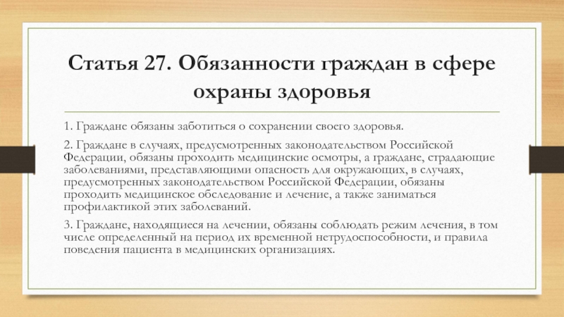 Слайд 28Статья 27. Обязанности граждан в сфере охраны здоровья