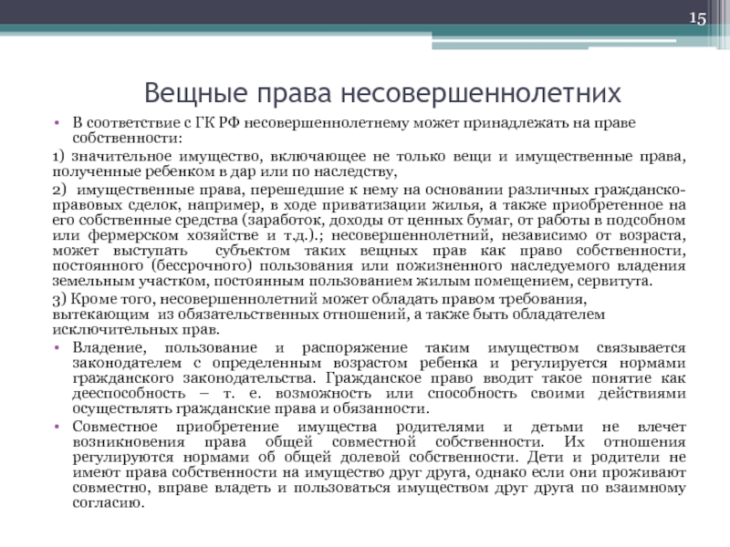 Слайд 15Вещные права несовершеннолетних