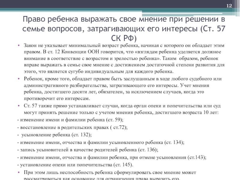 возраст ребенка, начиная с которого он обладает этим правом. В ст. 12 Конвенции ООН говорится, что «взглядам ребенка уделяется должное внимание в соответствие с возрастом и зрелостью ребенка». Таким образом, ребенок вправе выражать в семье свое мнение с достижением достаточной степени развития для этого, что является сугубо индивидуальным для каждого ребенка.