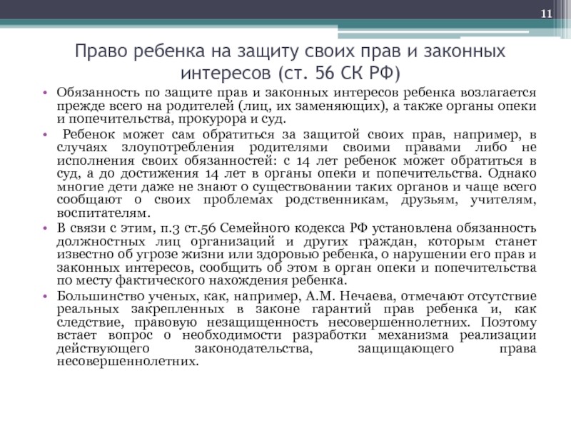 Слайд 11Право ребенка на защиту своих прав и законных интересов (ст.