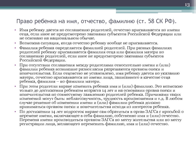 Слайд 13Право ребенка на имя, отчество, фамилию (ст. 58 СК РФ).