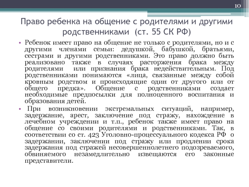 Слайд 10Право ребенка на общение с родителями и другими родственниками (ст.