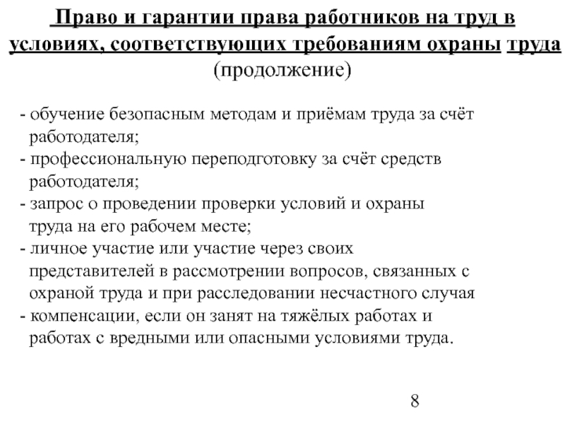 Слайд 8 Право и гарантии права работников на труд в условиях,