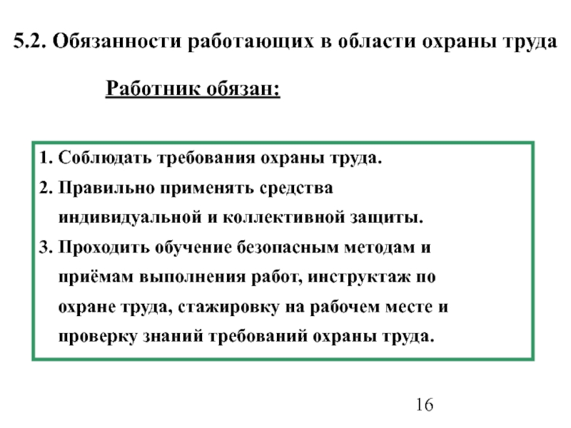 Слайд 165.2. Обязанности работающих в области охраны труда