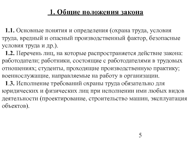 1.2. Перечень лиц, на которые распространяется действие закона: работодатели; работники, состоящие с работодателями в трудовых отношениях; студенты, проходящие производственную практику; военнослужащие, направляемые на работу в организации.