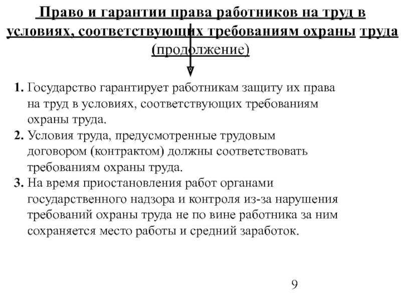 Слайд 9 Право и гарантии права работников на труд в условиях,