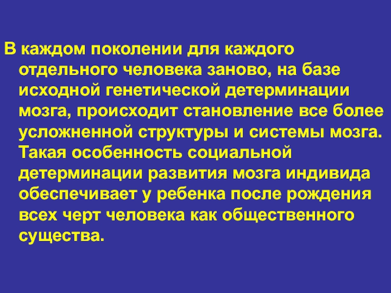 и системы мозга. Такая особенность социальной детерминации развития мозга индивида обеспечивает у ребенка после рождения всех черт человека как общественного существа.