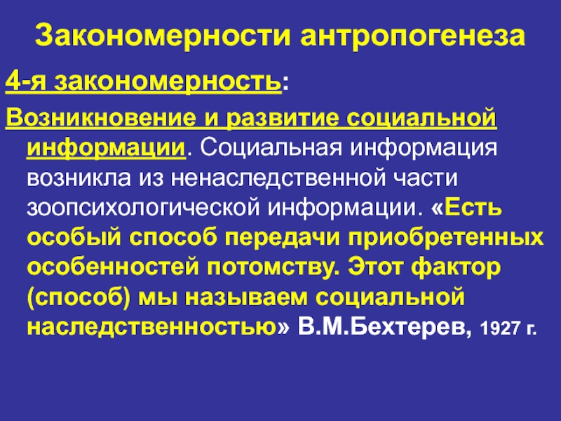 приобретенных особенностей потомству. Этот фактор (способ) мы называем социальной наследственностью» В.М.Бехтерев, 1927 г.