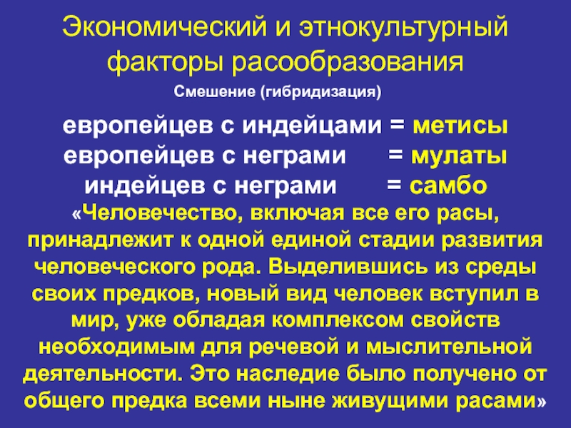 «Человечество, включая все его расы, принадлежит к одной единой стадии развития человеческого рода. Выделившись из среды своих предков, новый вид человек вступил в мир, уже обладая комплексом свойств необходимым для речевой и мыслительной деятельности. Это наследие было получено от общего предка всеми ныне живущими расами»