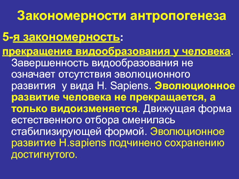 человека не прекращается, а только видоизменяется. Движущая форма естественного отбора сменилась стабилизирующей формой. Эволюционное развитие H.sapiens подчинено сохранению достигнутого.