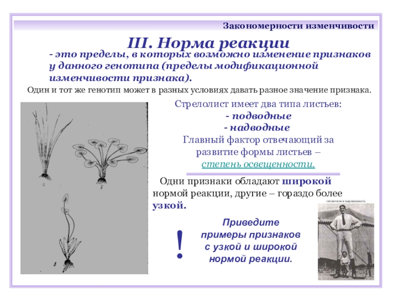Одни признаки обладают широкой нормой реакции, другие – гораздо более узкой.