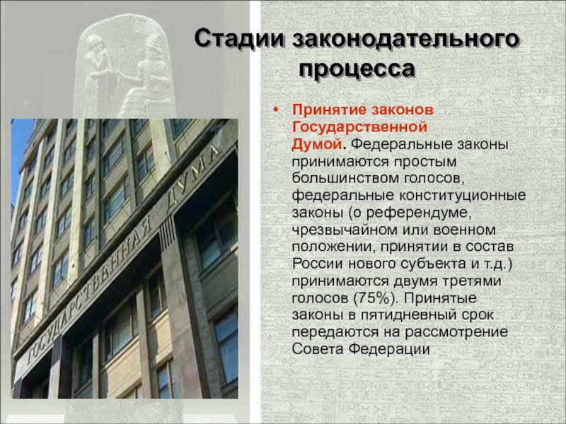 принятии в состав России нового субъекта и т.д.) принимаются двумя третями голосов (75%). Принятые законы в пятидневный срок передаются на рассмотрение Совета Федерации