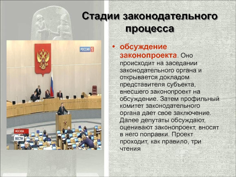 обсуждение законопроекта. Оно происходит на заседании законодательного органа