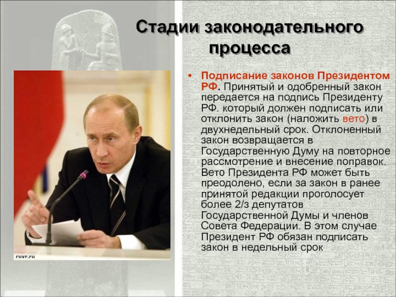 Подписание законов Президентом РФ. Принятый и одобренный закон передается