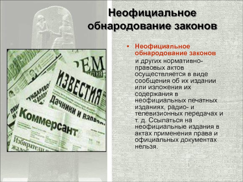 их содержания в неофициальных печатных изданиях, радио- и телевизионных передачах и т. д. Ссылаться на неофициальные издания в актах применения права и официальных документах нельзя.