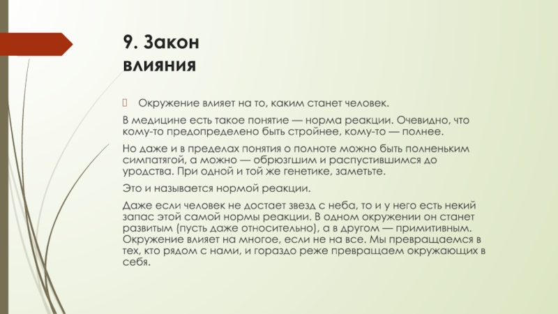 Даже если человек не достает звезд с неба, то и у него есть некий запас этой самой нормы реакции. В одном окружении он станет развитым (пусть даже относительно), а в другом — примитивным. Окружение влияет на многое, если не на все. Мы превращаемся в тех, кто рядом с нами, и гораздо реже превращаем окружающих в себя.