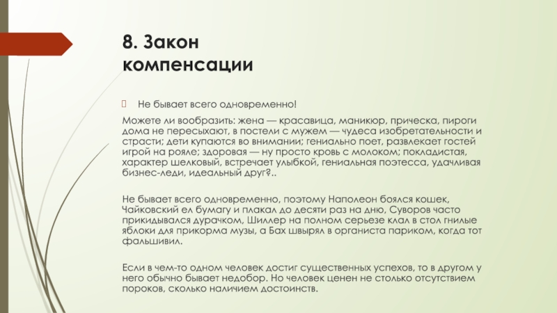 Не бывает всего одновременно, поэтому Наполеон боялся кошек, Чайковский ел бумагу и плакал до десяти раз на дню, Суворов часто прикидывался дурачком, Шиллер на полном серьезе клал в стол гнилые яблоки для прикорма музы, а Бах швырял в органиста париком, когда тот фальшивил.