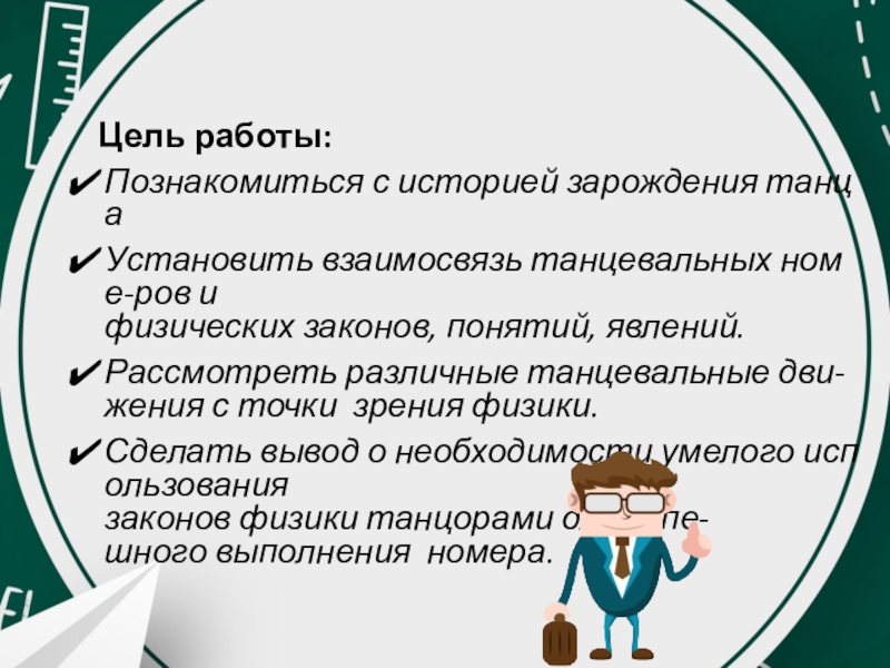 Цель работы: Познакомиться с историей зарождения танца Установить взаимосвязь танцевальных номе-ров и  физических законов, понятий, явлений.Рассмотреть различные танцевальные дви-жения с точки  зрения физики.Сделать вывод о необходимости умелого использования  законов физики танцорами для успе-шного выполнения  номера.