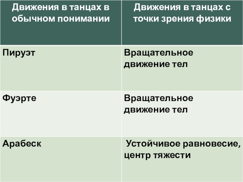 Рассмотреть различные танцевальные дви-жения с точки  зрения физики.
