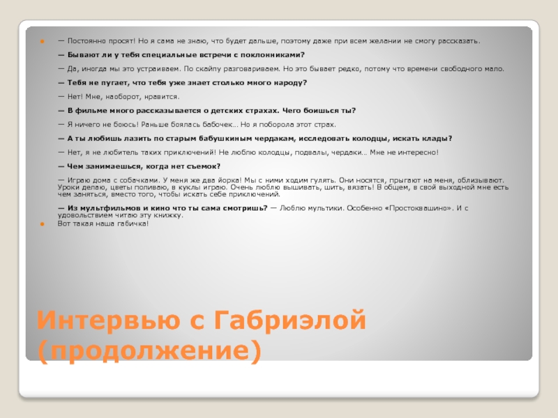 поклонников мистического сериала СТС. Габи, как называют девочку родные, играет роль Нади Авдеевой – девочки, родители которой пропали без вести во время прогулки на яхте. В интервью Габи рассказывает о творчестве, жизни и планах на будущее.