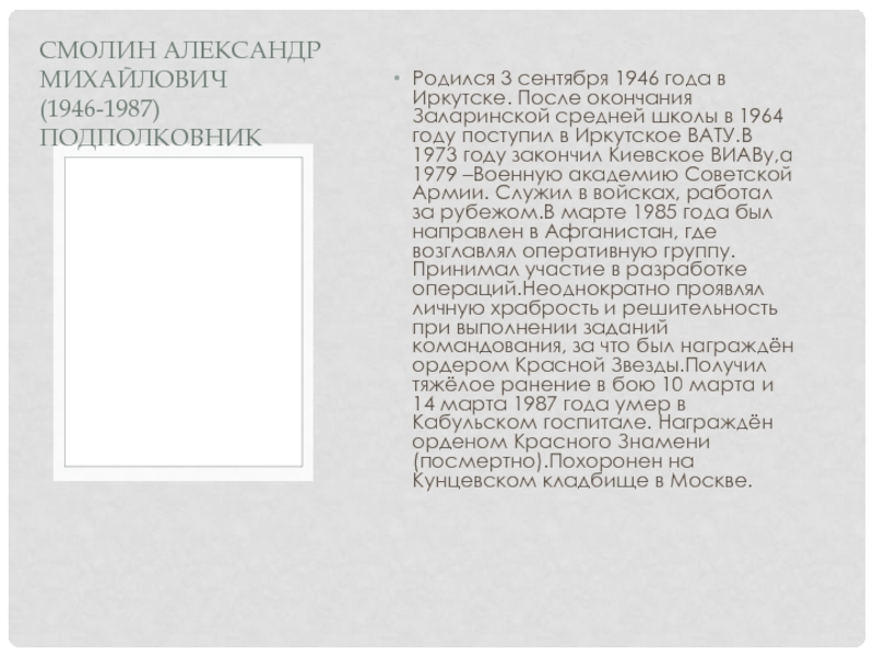 уроки по основам безопасности жизнедеятельности. А кроме того, занимается с ребятами в патриотическом клубе «Витязь», дружине юных пожарных «Огнеборец» и в клубе инспекторов дорожного движения «Светофорик». Как человек бывалый, Владимир Сергеевич считает, что все эти знания и навыки могут пригодиться молодым людям в разных житейских ситуациях. А ещё – он пишет стихи о незабываемых днях войны.Ткаличев Владимир Сергеевич