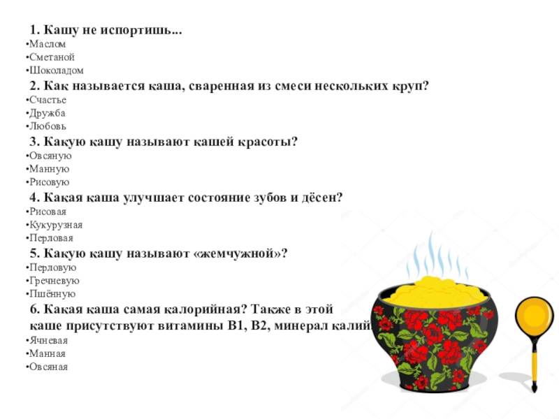 1. Кашу не испортишь...МасломСметанойШоколадом2. Как называется каша, сваренная из смеси нескольких круп?СчастьеДружбаЛюбовь3. Какую кашу называют кашей красоты?ОвсянуюМаннуюРисовую4.