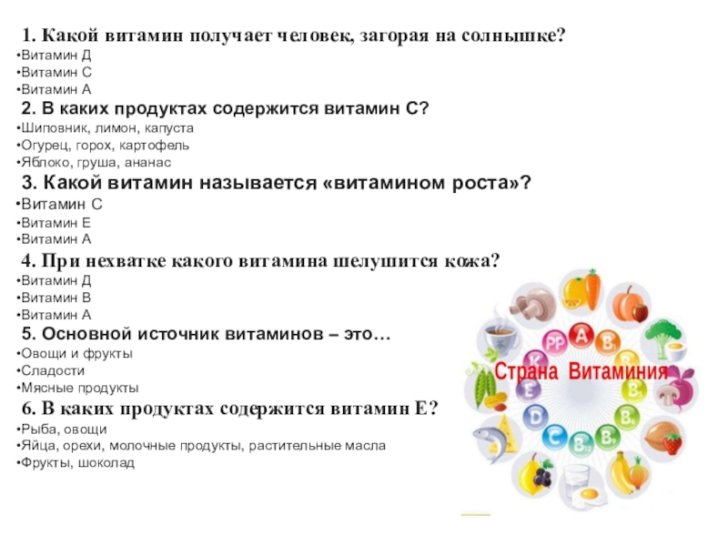 1. Какой витамин получает человек, загорая на солнышке?Витамин ДВитамин СВитамин А2. В каких продуктах содержится витамин С?Шиповник, лимон,