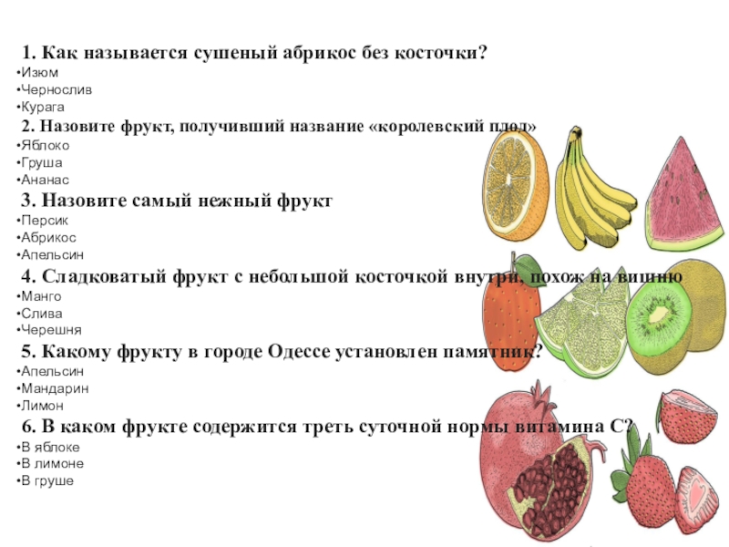 1. Как называется сушеный абрикос без косточки?ИзюмЧерносливКурага2. Назовите фрукт, получивший название «королевский плод»ЯблокоГрушаАнанас3. Назовите самый нежный фруктПерсикАбрикосАпельсин4. Сладковатый