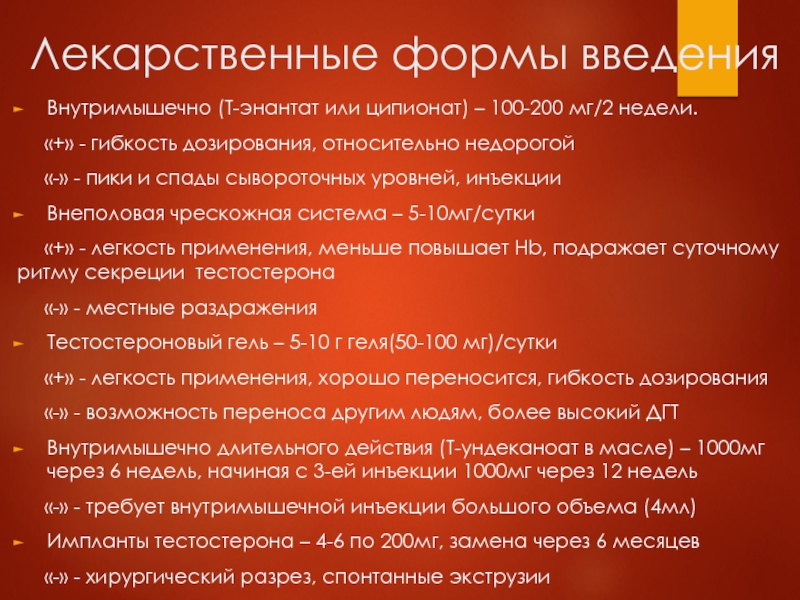«+» - легкость применения, меньше повышает Hb, подражает суточному ритму секреции тестостерона