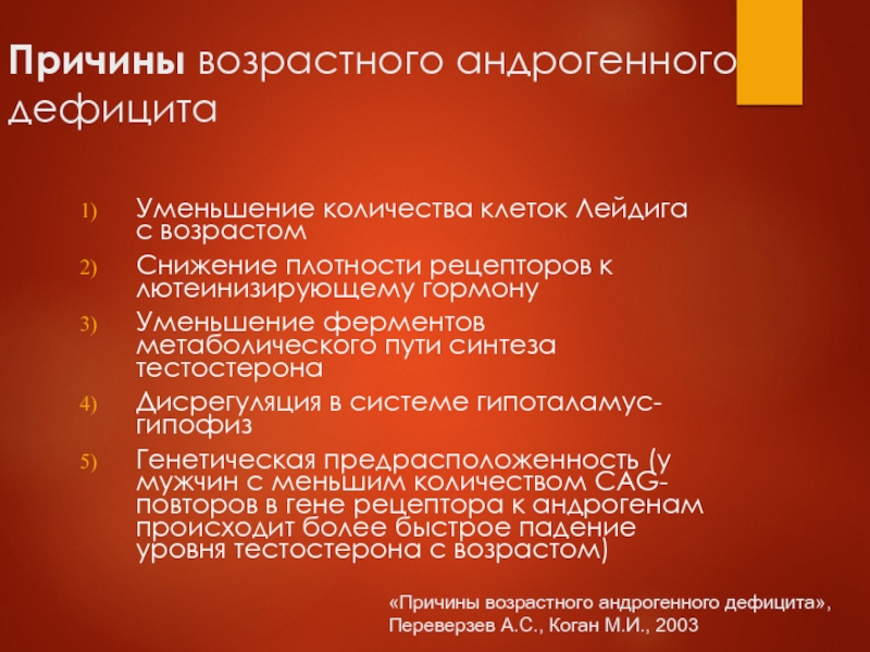 Генетическая предрасположенность (у мужчин с меньшим количеством CAG-повторов в гене рецептора к андрогенам происходит более быстрое падение уровня тестостерона с возрастом)