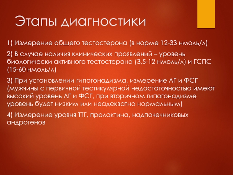 3) При установлении гипогонадизма, измерение ЛГ и ФСГ (мужчины с первичной тестикулярной недостаточностью имеют высокий уровень ЛГ и ФСГ, при вторичном гипогонадизме уровень будет низким или неадекватно нормальным)