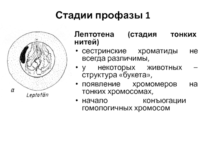 Стадии профазы 1Лептотена (стадия тонких нитей)сестринские хроматиды не всегда различимы, у некоторых животных – структура «букета», появление