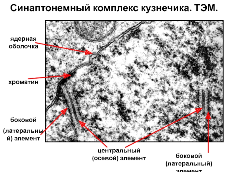 Синаптонемный комплекс кузнечика. ТЭМ.центральный         (осевой) элементбоковой (латеральный) элементядерная оболочкахроматинбоковой