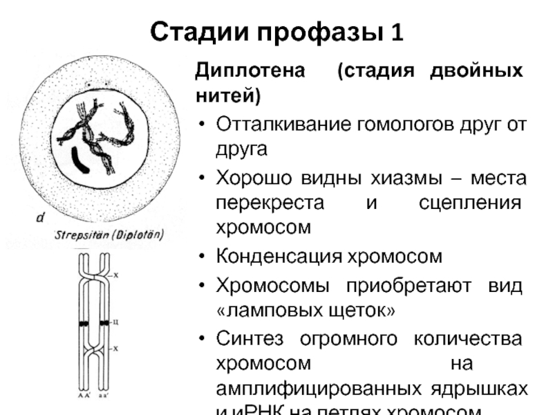 Стадии профазы 1Диплотена (стадия двойных нитей)Отталкивание гомологов друг от другаХорошо видны хиазмы – места перекреста и сцепления