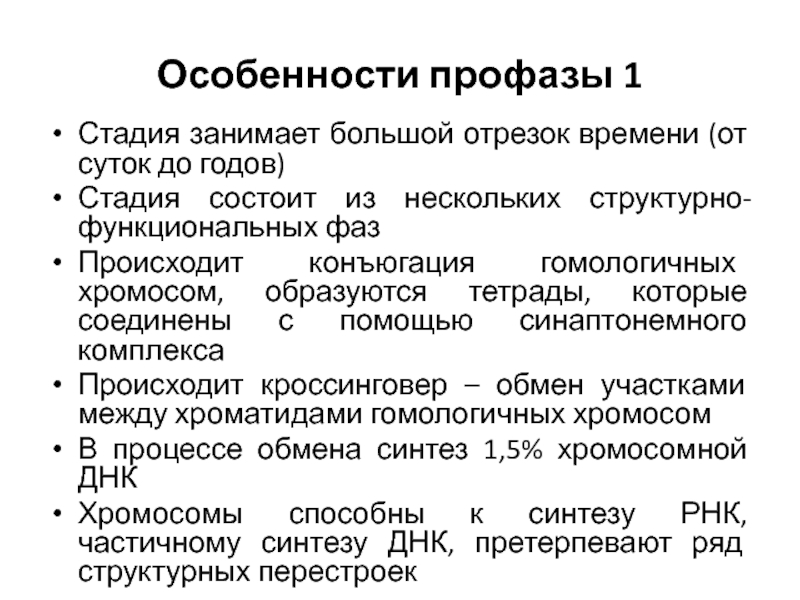 Особенности профазы 1Стадия занимает большой отрезок времени (от суток до годов)Стадия состоит из нескольких структурно-функциональных фазПроисходит конъюгация