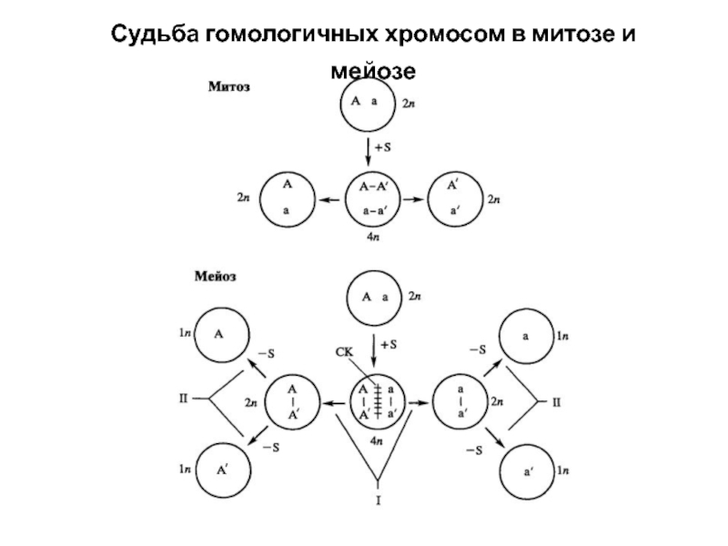 Слайд 32Судьба гомологичных хромосом в митозе и мейозе