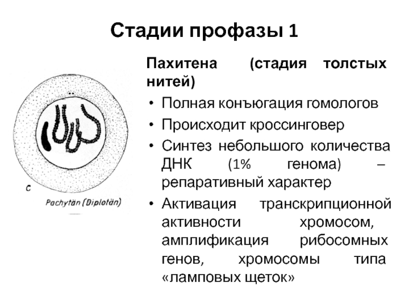 Стадии профазы 1Пахитена (стадия толстых нитей)Полная конъюгация гомологовПроисходит кроссинговерСинтез небольшого количества ДНК (1% генома) – репаративный характерАктивация