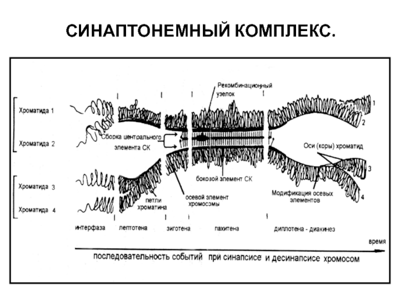 Синаптонемный комплекс.ТЭМ.центральный         (осевой) элементядерная оболочкахроматинбоковой (латеральный) элементсинаптонемный комплекс при