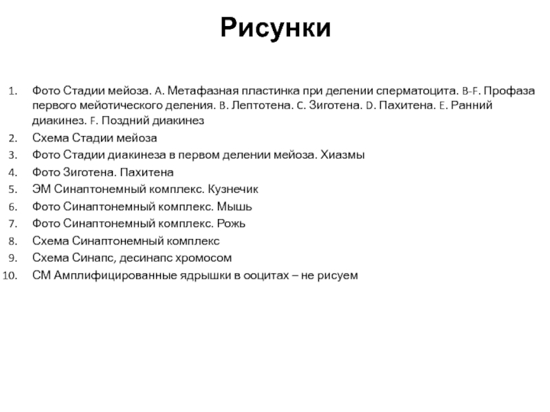 РисункиФото Стадии мейоза. A. Метафазная пластинка при делении сперматоцита. B-F. Профаза первого мейотического деления. B. Лептотена. C.