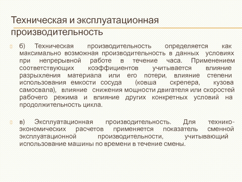в) Эксплуатационная производительность. Для технико-экономических расчетов применяется показатель сменной эксплуатационной производительности, учитывающий использование машины по времени в течение смены.